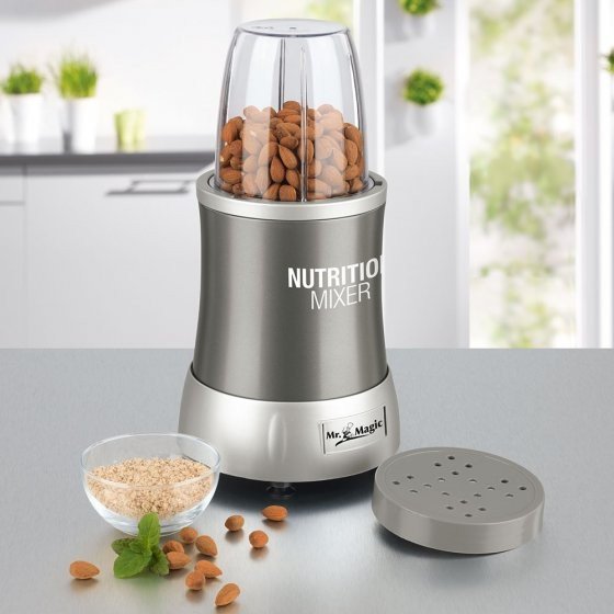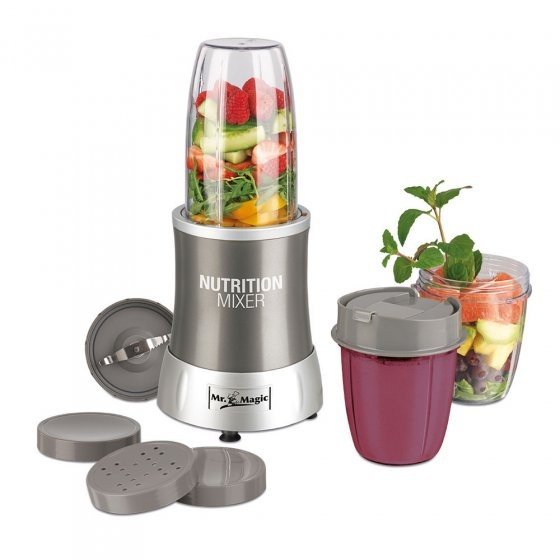 ELECTRO-MENAGER : Le MR. MAGIC NUTRITION MIXER vous permet non seulement de préparer de bons smoothies, mais aussi des cocktails, milkshakes, desserts, sauces et dips ainsi qu'une multitude d'autres plats et boissons, en seulement quelques minutes. Cet appareil de cuisine mixe, mélange, émince, moud, hache, bat et réduit en purée tous les ingrédients de votre choix. Grâce à ses lames extra tranchantes tournant à vitesse turbo, tout est prêt en un éclair ! Fonctionne sur le secteur 230 V (L x l x h) env. 14 x 14 x 34 cm. Vous pouvez aussi emporter toute la fraîcheur de votre smoothie puisque le Nutrition Mixer Mr Magic comporte un gobelet pratique livré non seulement avec un couvercle de conservation mais aussi avec un couvercle pour emporter votre boisson avec vous.